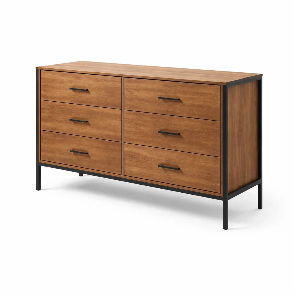 La cassettiera presenta una struttura in acciaio e pannelli in MDF finitura legno naturale. Dispone di sei cassetti per un'ampia capacità di archiviazione interna.
