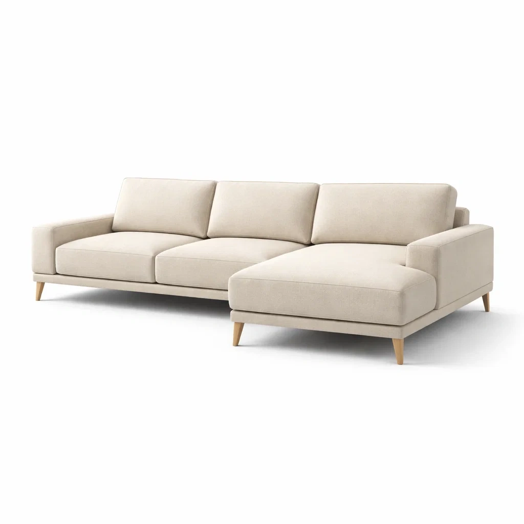 Il divano è realizzato con una struttura in legno massello e rivestito in tessuto sintetico beige. Le gambe sono in legno, fornendo un supporto stabile. Le dimensioni complessive sono 300 cm in lunghezza, 160 cm in larghezza e 85 cm in altezza, con una seduta di 45 cm. Il divano pesa 65 kg e ha una configurazione angolare con chaise longue. I cuscini sono rimovibili per facilitare la pulizia.