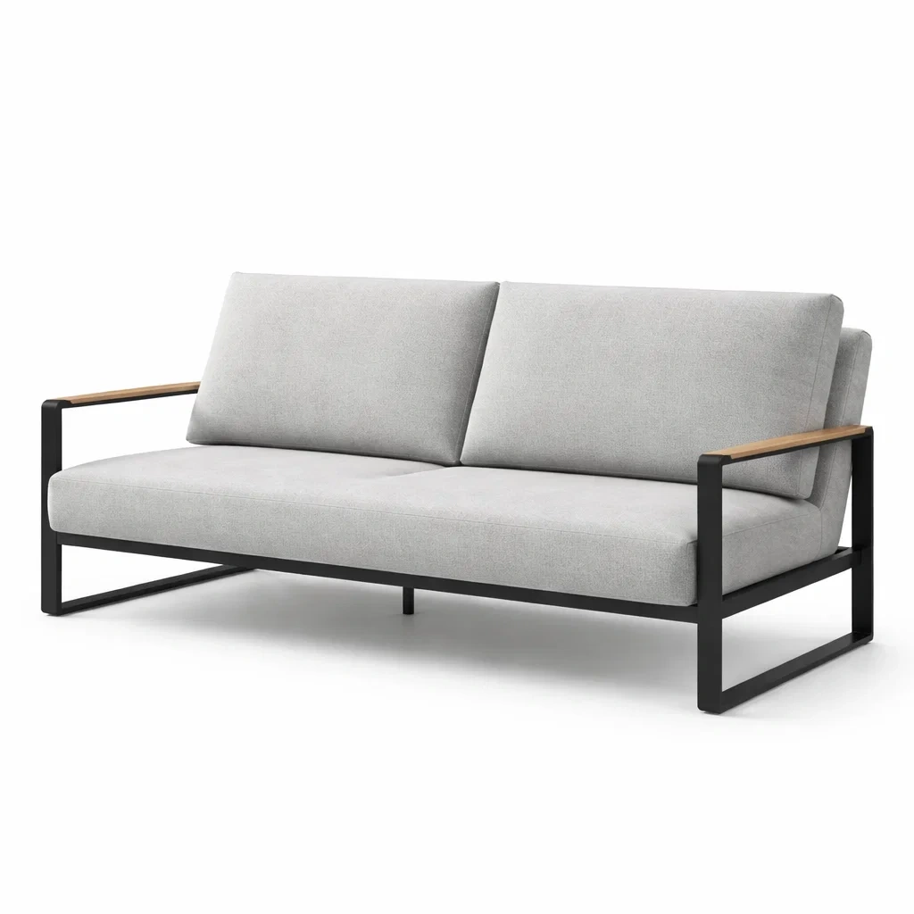 Il telaio è realizzato in metallo robusto, mentre il rivestimento è in poliestere grigio. I braccioli sono in legno.