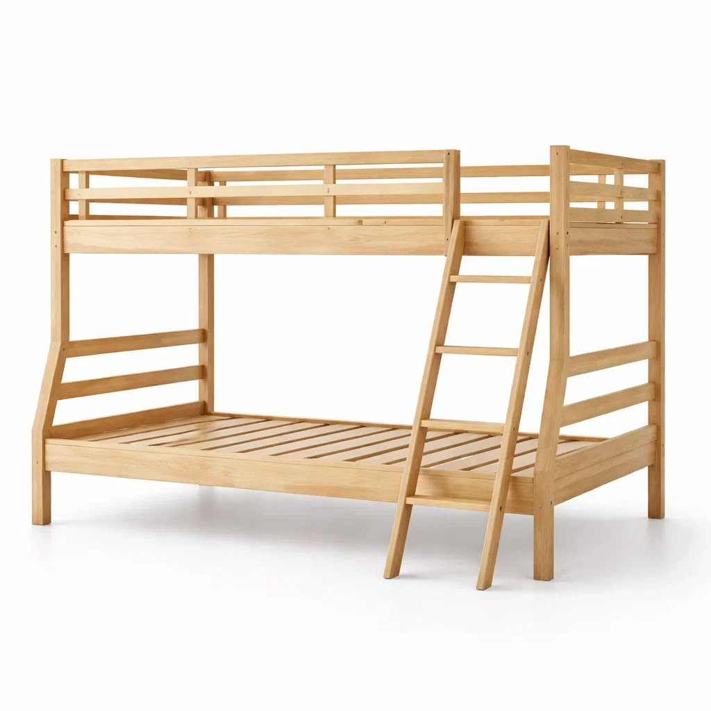 Questo letto a castello è realizzato in legno di pino naturale, offrendo una struttura robusta e durevole. Le dimensioni sono di 200 cm in lunghezza, 100 cm in larghezza e 150 cm in altezza. Include una scaletta inclinata e sponde di sicurezza alte 35 cm. È conforme agli standard di sicurezza EN 747 ed è adatto per bambini di età superiore a 6 anni.