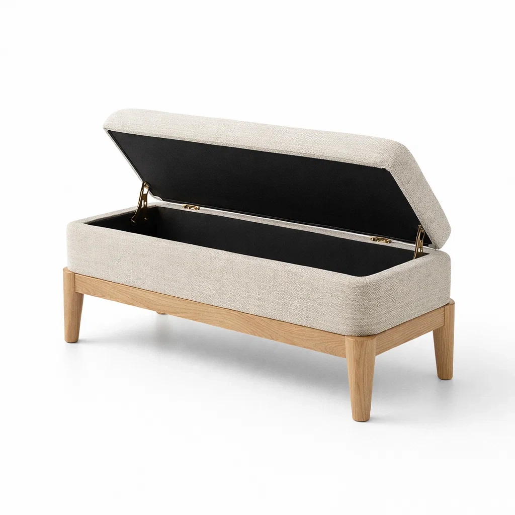 La panca contenitore è realizzata in tessuto di lino beige con una struttura in legno di quercia massiccio. Il vano interno è foderato con tessuto sintetico nero. Le dimensioni sono 120 cm di lunghezza, 40 cm di larghezza e 45 cm di altezza. Il peso totale è di 16.5 kg. Il vano interno offre uno spazio utile per riporre vari oggetti.