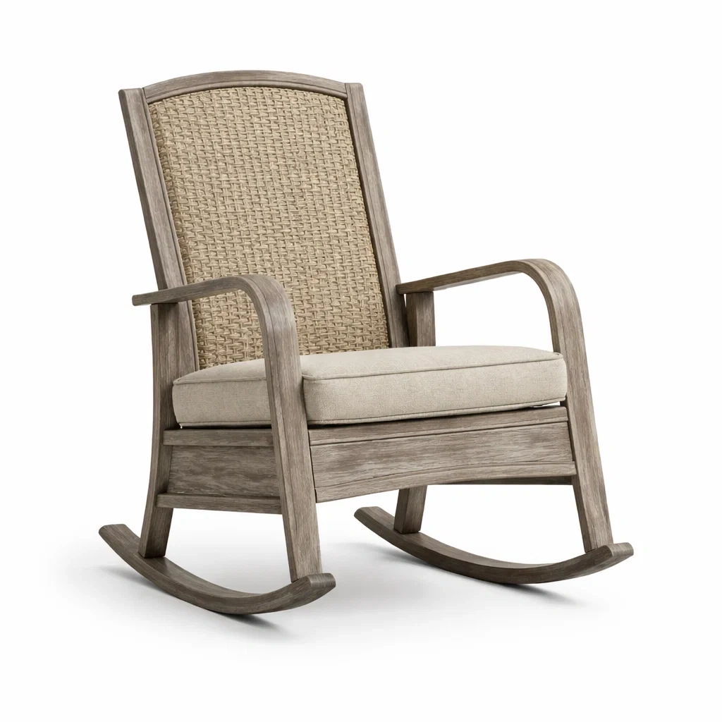 Sedia a dondolo in legno con schienale in rattan e cuscini poliestere beige