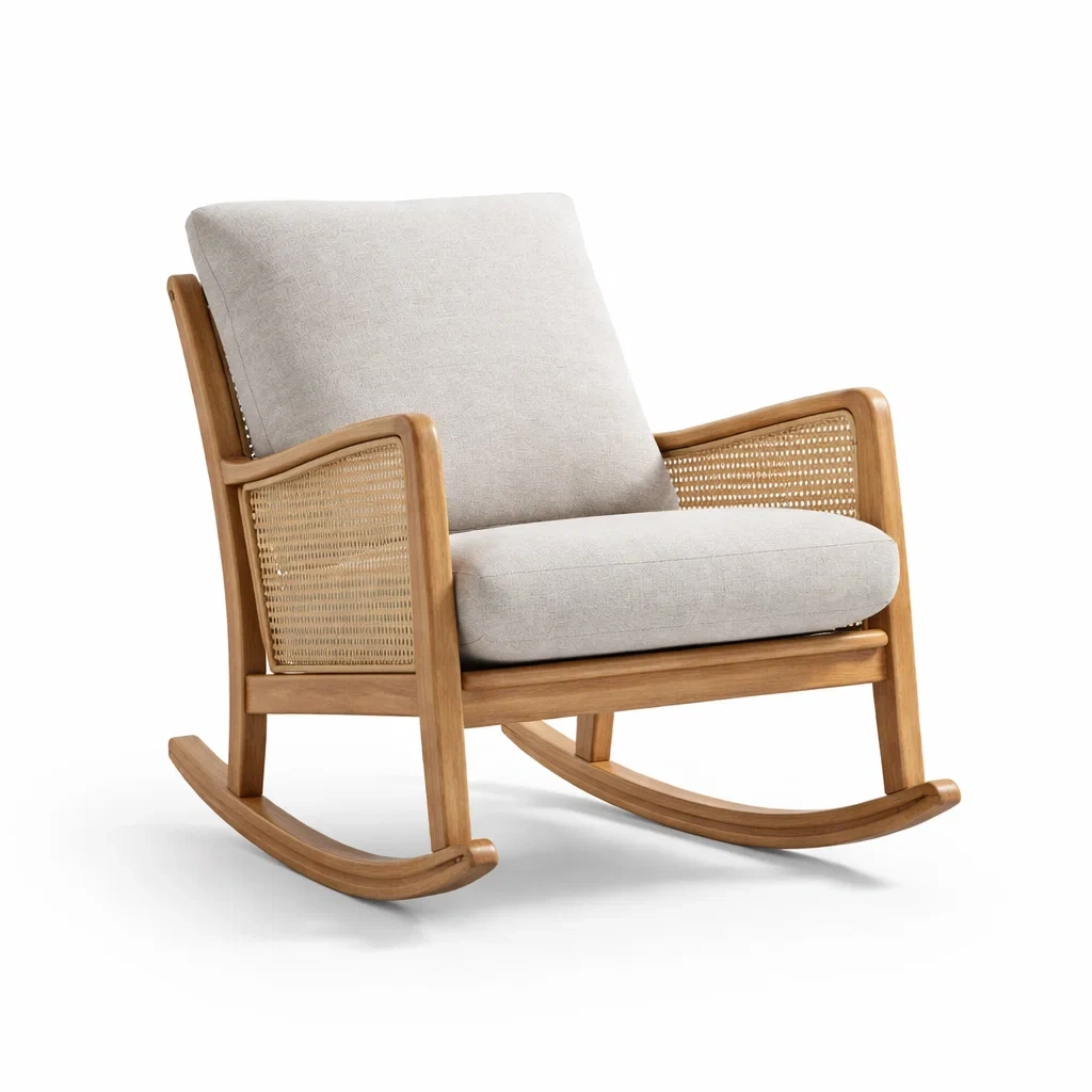 La sedia a dondolo è realizzata in legno massello con un rivestimento in tessuto di poliestere e lati in rattan intrecciato.